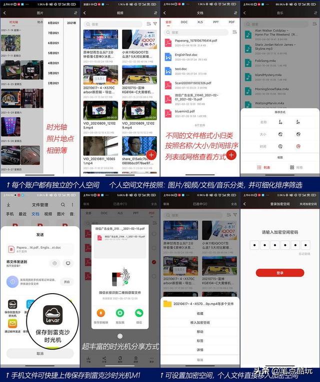 从下图可以看到个人空间内还做了图片/视频/文档/音乐的4大分类筛选页面,以及更为细致的小归类,比如图片中可以按照相册拍摄照片时间排成“时光轴”,也可以按照照片定位信息查看“照片地图”。文档可按4种常用格式分类查看,排序方式也可以自选。个人文件可以复制、移动到其他文件夹、公共空间,也可以直接挪到个人账户的“加密空间”,“学习资料”可以藏得好好的咯。
