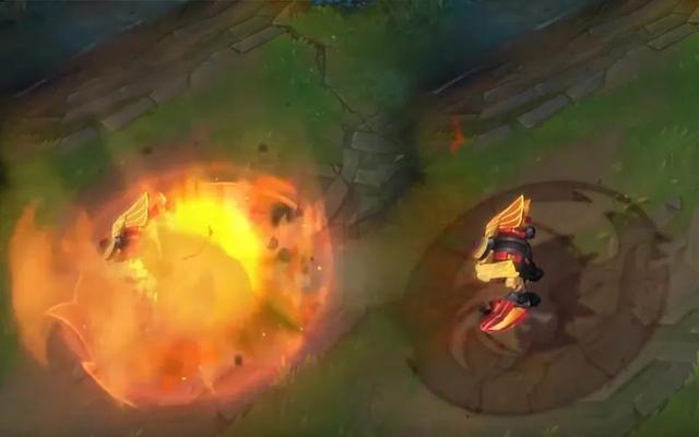 R技能在撞击之后会形成一片火焰范围,结束之后会出现FPX队标的印记,R技能有些可惜,如果在飞行过程能能出现翅膀就好了,就好像锤石Q技能飞向目标以及薇恩开启R技能时的效果。