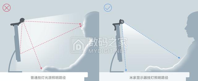 米家屏幕挂灯标榜的也是非对称照明设计,这个非对称照明,在屏幕挂灯上非常重要,可以有效减少灯光在屏幕上造成的反射,刺激人眼。不过似乎后来小米翻车了,带着柔光罩根本看不出效果!