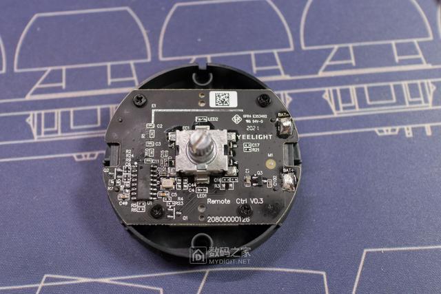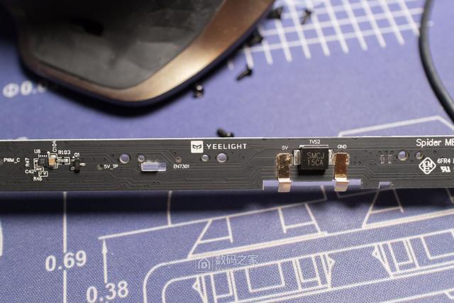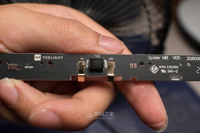 PCB印着代工厂Yeelight的标志,中间的两个铜片就是电源触点,中间最大的SMCJ是个贴片二极管,为了防止反装吧。