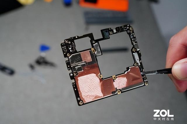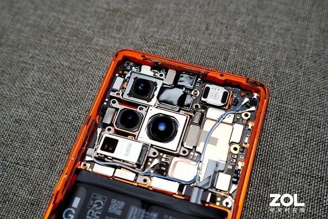 在移去主板盖板之后,我们便可以看到vivo X80 Pro后置摄像头模组与主板的全貌,下一步我们将摄像头模组拆下。