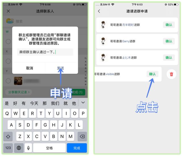 开启这个功能后,当你邀请好友进群时,需要向群主或群管理员描述原因,当他们看到申请后,点击「确认」按钮,即可进群,左滑可以删除。
