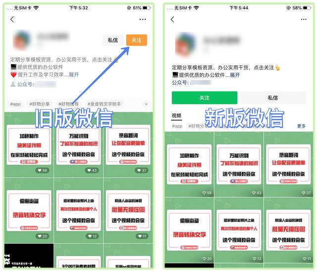 微信视频号主页也进行了细微的调整,旧版主页中的“私信”和“关注”按钮在右侧,新版主页则显示在下方,而且按钮变大了,橙色变成绿色。