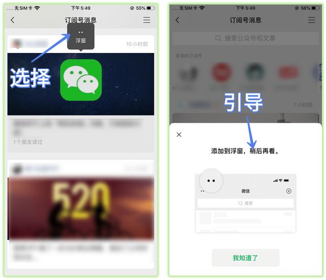 新版微信订阅号消息,也有新增的功能,当你长按文章标题或封面时,会出现「悬浮」按钮,可以选择稍后再看,在微信首页右滑就能找到。