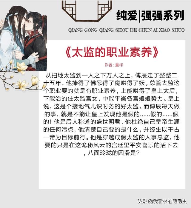 小短评:步步为营心机攻 x 端方冷漠皇子受,主攻权谋,宫廷正剧风,强强。心理医生攻穿越古代,因饥荒代替哥哥入宫通过催眠成为假太监。受是母妃被打入冷宫的不受宠落魄皇子,装疯卖傻被人欺侮,攻却私下里对受悉心照顾展露温情。于是受想把攻收为己用,两人互相试探互相猜疑,各种误会。受先动心喜欢上攻,自己却不知道,在以为攻死后伤心欲绝一夜白头,其实攻是借机去卧底邻国找boss下了很大一盘棋。最后两人携手逆天改命,登上皇位。攻在现代是天煞孤星的心理医生,为人理智心机深沉各种扮猪吃老虎,而且前期特别直。受身为霸气侧漏端方冷漠的皇子,在攻面前人设分分钟崩塌,各种傲娇痴汉。剧情线很精彩,张弛有度,强烈推荐!