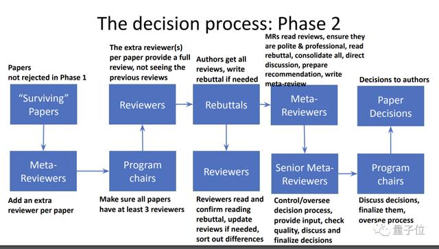 在第一阶段,每篇论文分配至少两个审稿人,如果两人一致认为应该拒稿,交给元审稿人再判断一次,最终提交给会议主席做决定。