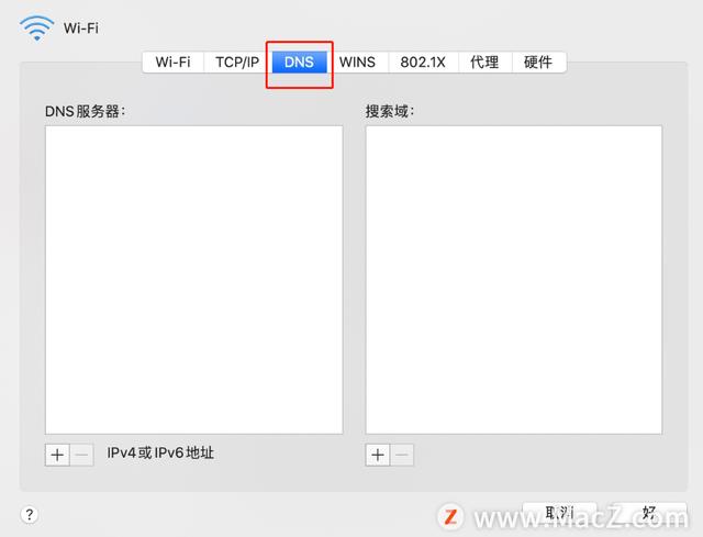 3.接着请在网络连接的设置窗口中,点击 DNS 一栏,如图所示: