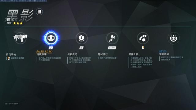 黑影的shift技能为隐秘潜行。使用后自身会进入隐身状态,冷却时间为脱离隐身后六秒。在隐身期间,你的移动速度增加百分之60,不过在非常靠近敌人或者被某些透视技能发现后会提示现形。这类透视技能包括:敌方黑影的被动,黑百合的终极技能,半藏的音波箭等等。除了这些之外,受到任意伤害或者有任何攻击动作也会脱离隐身状态。传送信标不会受此影响。