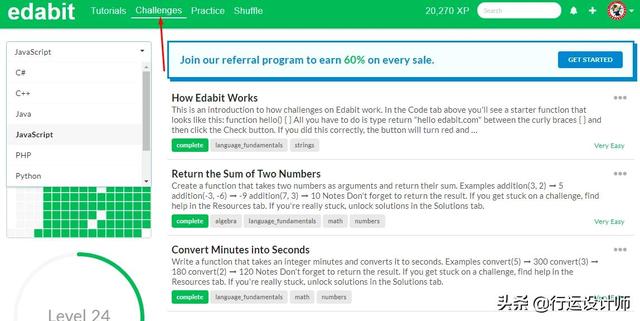打开Edabit,首先就是要注册,或者用Google或者Facebook帐号登录,进入后在Challenges分类中,选择对应语言,选择对应难度,初学者自然是选择非常简单了,如下图所示: