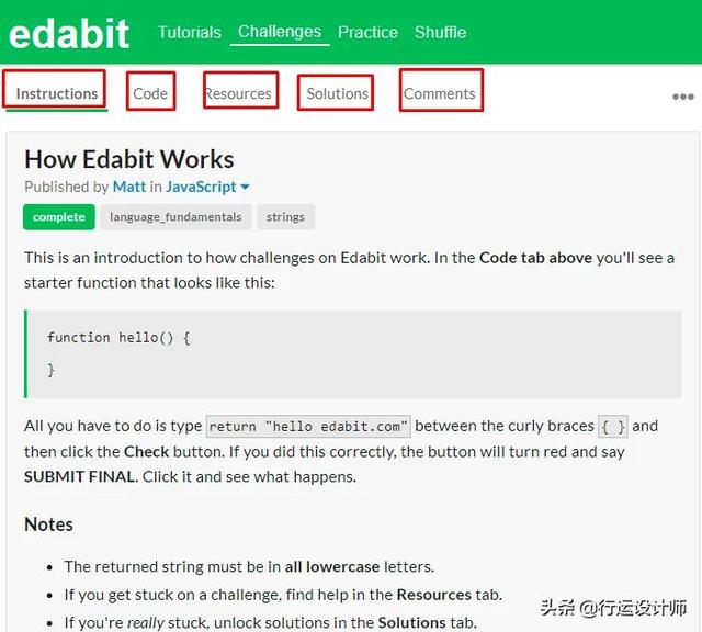 之后就陆续刷题就可以了,一道道来,这些题目也都是从最简单的开始的,比如就以“Javascript”为例,可以看到有一个“How Edabit Works”,点开后进入画面是这样的: