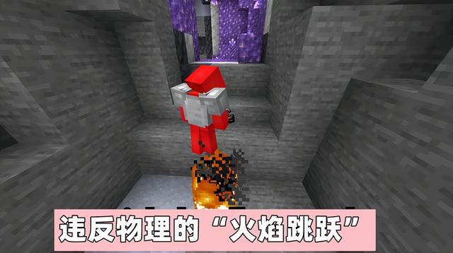 在史蒂夫受到伤害时,会被击退一段距离,而击退的方向与受到伤害的方块相反,所以当玩家跳起时恰好受到火焰伤害,就会被击退一定距离,熟练使用这一技巧后,就能跳到2格高的方块上了,在Dream的视频中,也经常能够看到这个技巧被使用。