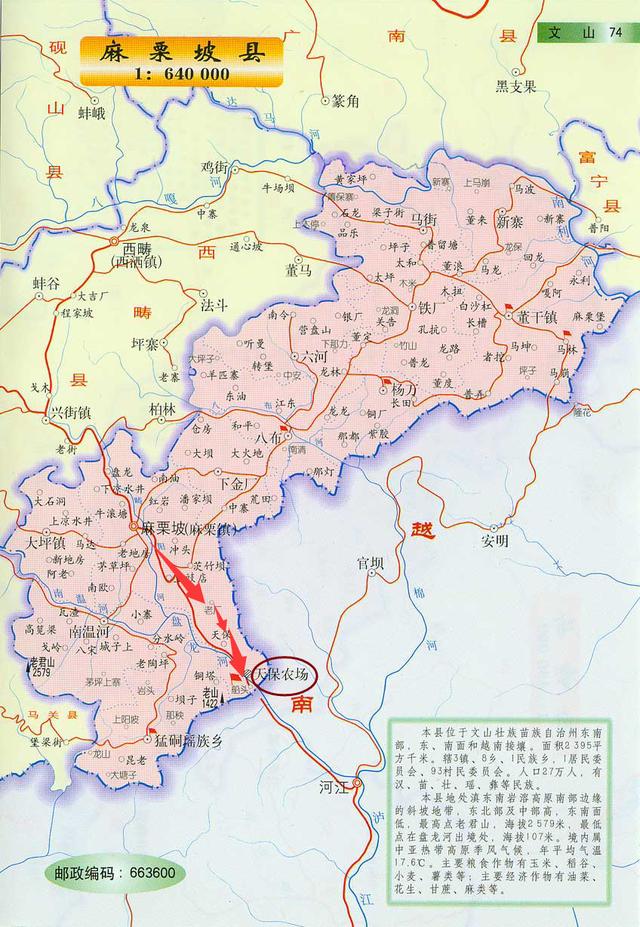 麻栗坡县城与天保口岸的位置对应关系。在此幅地图中所标注的“天保农场”,始建于1958年,现属云南农垦集团有限责任公司文山分公司管辖,为国有农经型企业。农场区坐落于河谷地带,最高海拔770米,最低海拔107米,属典型的亚热带半湿润季风气候,热量丰富,雨量适中,全年基本无霜,相对湿度较大,气候垂直差异也十分明显。农场拥有“橡胶、肉桂、龙眼”等各类风物耕植,粮食作物则“一年二熟”。