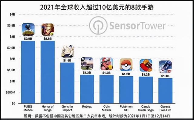 而且2021年全球收入超过10亿美元的8款手游,《原神》排名第三,收入仅次于《和平精英》、《王者荣耀》,如果从2020年9月份上线算起,《原神》累计收入达到了18亿美元(折合人民币114亿)。