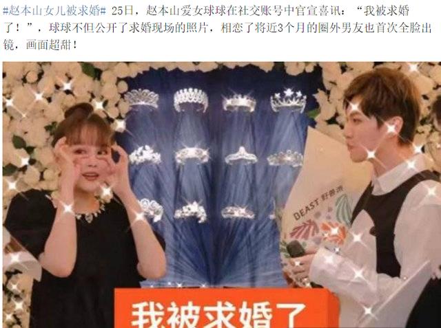 6月25号,赵本山的女儿球球在社交平台上官宣喜讯,宣称“我被求婚了!”并且感谢网友们的祝福。