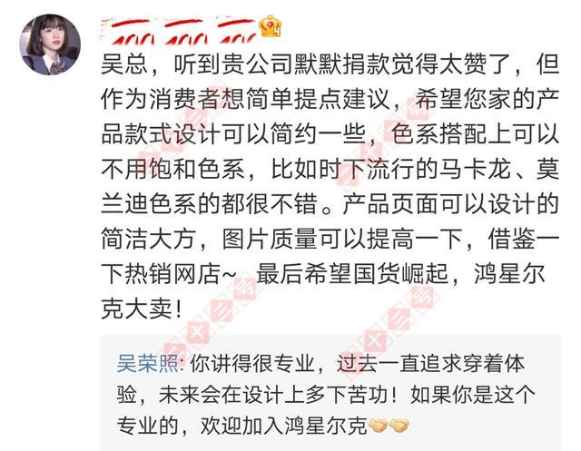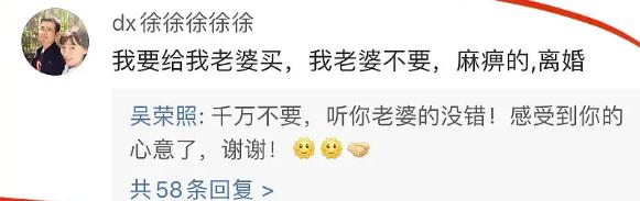 当然,这次吴荣照也很贴心,亲自回复说:千万不要,听你老婆的没错儿,感受到你的心意了,谢谢!