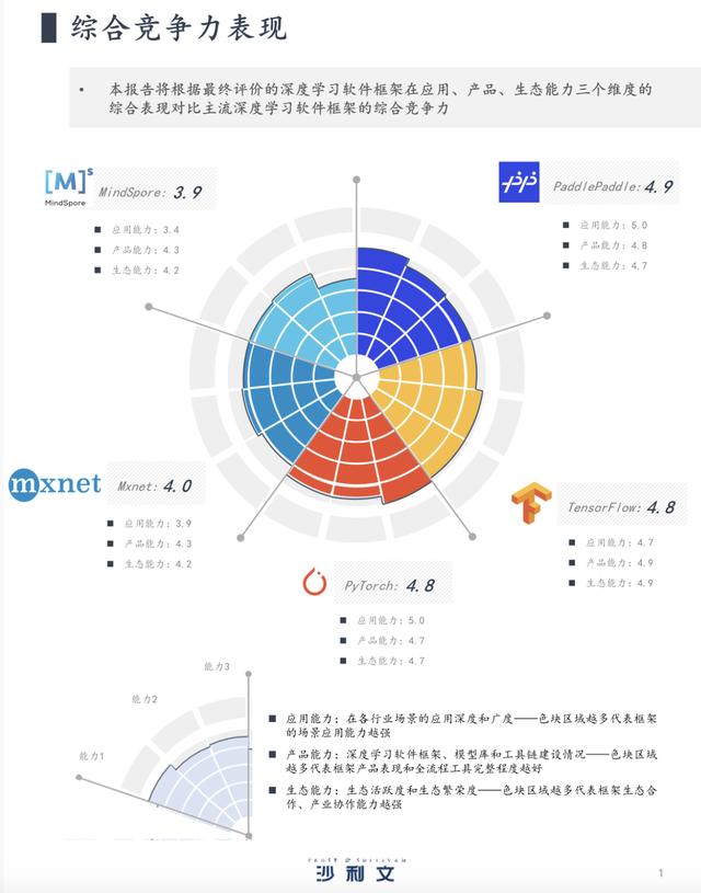报告认为,生态能力越强,则证明深度学习软件框架被更加广泛和频繁的使用,其生态合作、产业协作能力越强。