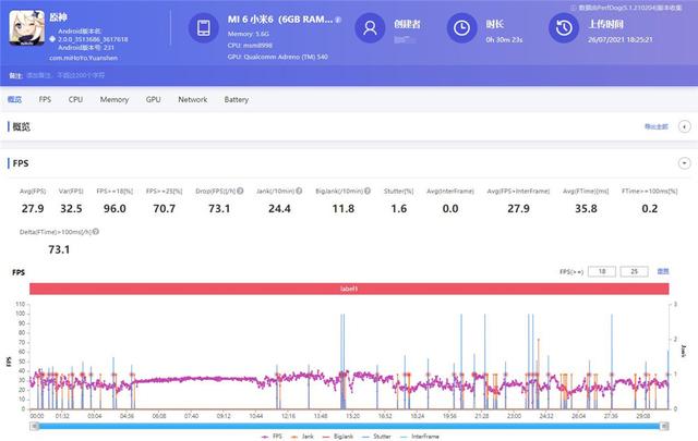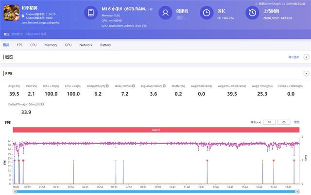 第一局帧数平稳,为了验证效果所以我们用上述配置再开了新的一局。从结果来看,小米6到目前为止的表现还是比较出众的,开场的一次卡顿(jank)确实有明显的感受,而最后结束时的卡顿则是来自于画面结算时的页面跳转,并不具备代表性。