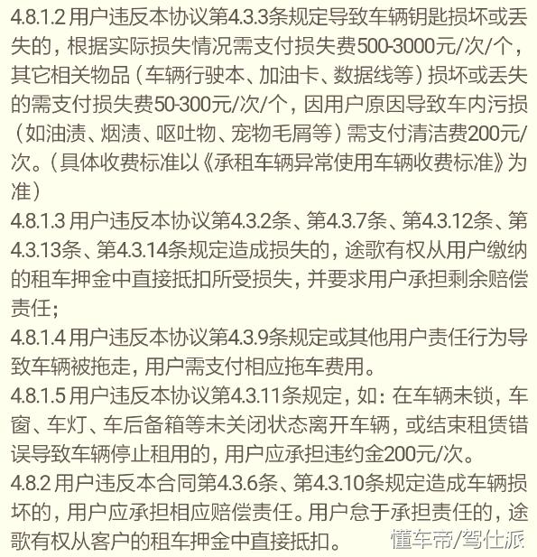 共享汽车整体价值较共享单车更大,加上大家平时也不怎么看《用户协议》的习惯,要特别提醒一点的是,注册途歌App时一定要细看用户协议。其中对各项用车事项、损伤费用都进行了明确的约定。比如“因用户原因导致车内污损(如油渍、烟渍、呕吐物、宠物毛屑等),需支付清洁费200元/次。”这种利于用车整洁环境的守则我是非常赞同的,老司机们就需要留意下平时的习惯了。