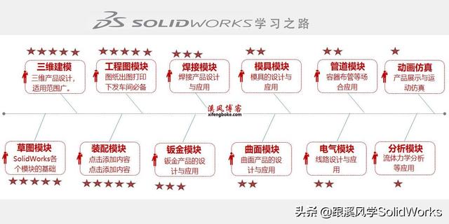 这里呢给大家简单的介绍一下SolidWorks这款软件,为什么给大家推荐SolidWorks,是因为SolidWorks是一款比较容易入手的三维设计软件,也正是这个特点,被大多数企业设计师工程师采用,所以选择SolidWorks,肯定没错。当然你可以在学好SolidWorks的同时去拓展其他的比如UGPROE等三维软件,那时候就非常容易入手其他软件了。SolidWorks功能也非常的强大,大体上还有以下几大模块:草图模块、建模(三维)、装配体模块、工程图模块、钣金模块、焊接模块、模具模块、曲面模块、管道模块、电气模块、仿真分析模块等,可以说总有适合企业产品的模块,关于SolidWorks的学习之路,如下图所示: