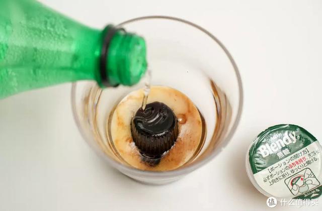 冰冻咖啡液+雪碧,尝试一下官方推荐的吃法。咖啡液在冰箱冻了36小时,要注意,咖啡液冰冻后要尽快喝掉,塑料壳子有可能会冻裂。