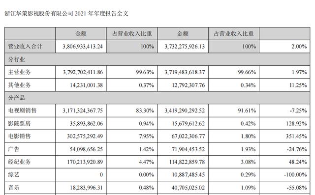 另外,华策影视称得上是一名“优等生”,2021年实现营业总收入38亿元,同比增长2%。财报显示,华策影视在2021年内首播的电视剧共18部,电视剧销售贡献了超八成营收,实现营收31.71亿元,但同比下滑7.25%。