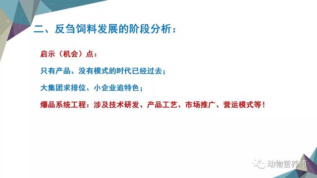 目前反刍饲料处于补品阶段、产品阶段、模式阶段的交叉期,模式阶段代表企业还没有真正出现;由于有其他行业的借鉴,反刍饲料将以跃迁式、并行式的发展;这表示只有产品、没有模式的时代已经过去;大集团求排位、小企业追特色;爆品系统工程涉及技术研发、产品工艺、市场推广、营运模式等!
