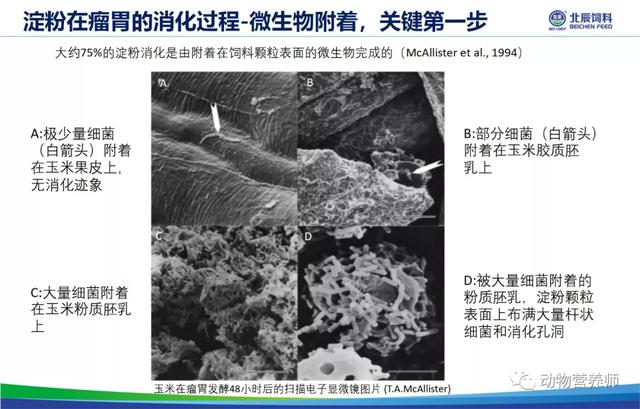谷物淀粉是高产奶牛和育肥场肉牛的主要能量来源,详细阐述了淀粉在瘤胃和小肠的消化和代谢,淀粉在瘤胃的消化过程-微生物附着,关键第一步;微生物酶解;挥发性脂肪酸吸收和代谢;