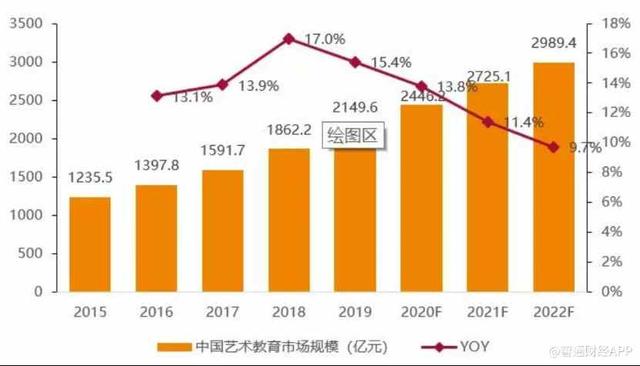 数据统计显示,2019年中国艺术培训市场规模2149.6亿元,预计2022年达2989.4亿元,三年均复合增长率11.6%。