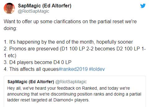 除此之外,在S9赛季中,英雄联盟引入了两个新的段位,包括傲世宗师段位。宗师段位的引入,使得高分段出现了一些问题。一些大师段位玩家的能力没有达到相应的水平,甚至胜率低到40%,却依然可以打到宗师段位。另一个情况则是一些钻石段位的玩家,打到了超乎水平的更高段位。设计师认为当前高分段存在一些不合理的BUG,他们决定进行段位重置。
