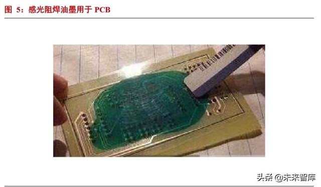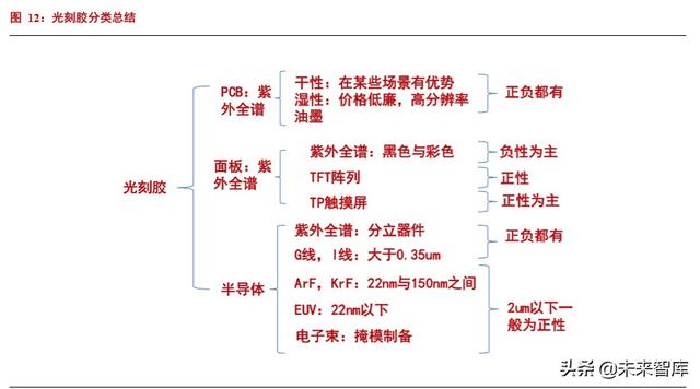 在 PCB 行业;主要使用的光刻胶有干膜光刻胶、湿膜光刻胶、感光阻焊油墨等。干膜是用特殊的薄膜贴在处理 后的敷铜板上,进行曝光显影;湿膜和光成像阻焊油墨则是涂布在敷铜板上,待其干燥后进行曝光显影。干膜与湿膜 各有优势,总体来说湿膜光刻胶分辨率高于干膜,价格更低廉,正在对干膜光刻胶的部分市场进行替代。