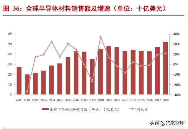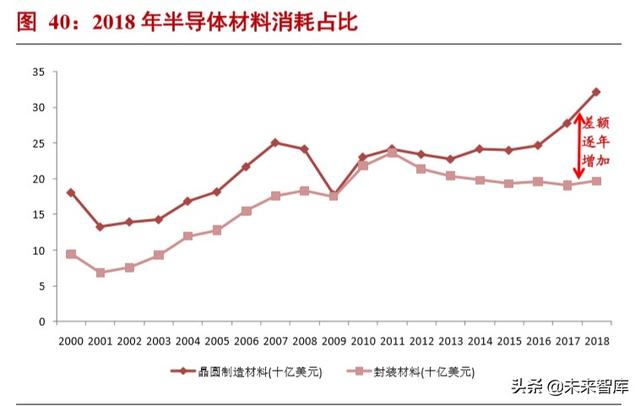 半导体制造材料占比逐年增加。半导体材料可分为封装材料和制造材料(包含硅片和各种化学品等等)。从长期 看,半导体制造材料和封装材料处于同趋势状态。但是从 2011 年之后,随着先进制程的不断发展,半导体制造材料的 消耗量逐渐增加,制造材料和封装材料的差距逐渐增加。2018 年,制造材料销售额为 322 亿美元,封装材料销售额为 197 亿美元,制造材料约为封装材料的 1.6 倍。