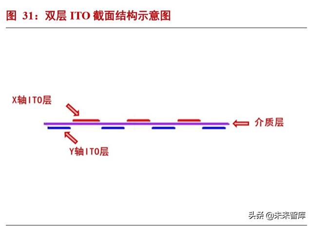 在触摸屏应用中,光刻工艺用于 ITO sensor 的制造。ITO 是一种 N 型氧化物半导体-氧化铟锡;将 ITO 材料 按照特定的图案,涂在玻璃或者 Film 上,然后贴在一层厚的保护玻璃上,就得到了 ITO sensor。ITO sensor 是触 摸屏的重要组成部分。触摸屏通过 ITO sensor 与 ITO sensor 之间的电容变化(双层 ITO 感应电容)或者 ITO sensor 与触摸屏幕的人体部位之间构成的电容变化(单层 ITO 表面电容)来感知触摸动作,并进而做出相对应的反应。 触摸屏中 ITO 结构的制造需要以氧化铟锡半导体材料在基底上构造出一定的图案,因此光刻和光刻胶技术在这 个过程当中同样是必不可少的。