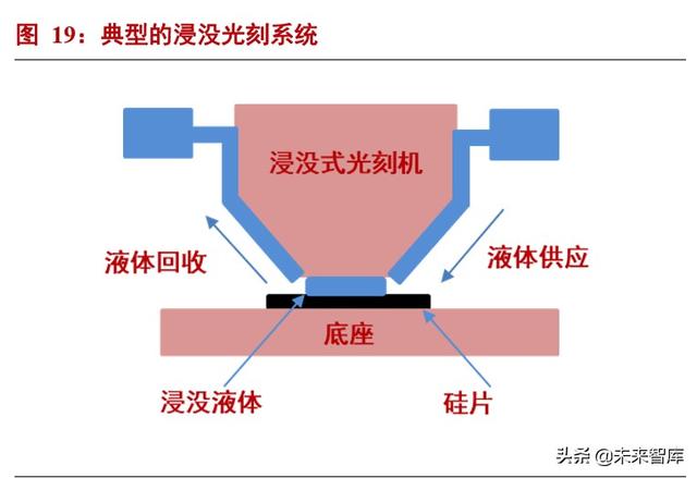 浸没光刻;在与浸没光刻相对的干法光刻中,光刻透镜与光刻胶之间是空气。光刻胶直接吸收光源发出的紫外辐 射并发生光化学反应。在浸没光刻中,光刻镜头与光刻胶之间是特定液体。这些液体可以是纯水也可以是别的化合物 液体。光刻光源发出的辐射经过这些液体的时候发生了折射,波长变短。这样,在不改变光源的前提条件下,更短波 长的紫外光被投影到光刻胶上,提高了光刻加工的分辨率。下图左展示了一个典型的浸没光刻系统。