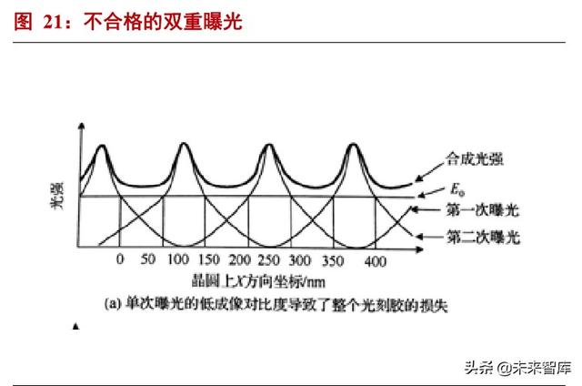 在双重曝光工艺中,若光刻胶可以接受多次光刻曝光而不在光罩遮挡的区域发生光化学反应,就可以节省一次刻 蚀,一次涂胶和一次光刻胶清洗流程。下图左展示了一次不合格的双重曝光过程。由于在非曝光区域光刻胶仍然会接 受到相对少量的光刻辐射,在两次曝光过程后,非曝光区域接受到的辐射有可能超过光刻胶的曝光阈值 E0,而发生错 误的光刻反应。在下图右中,非曝光区域的光刻胶在两次曝光后接受到的辐射能量仍然小于其曝光阈值 E0,因此下图 右是一次合格的双重曝光。从这个例子可以看出,与单次曝光不同,双重曝光要求光刻胶的曝光阈值和光刻光源的照 射强度之间的权衡。