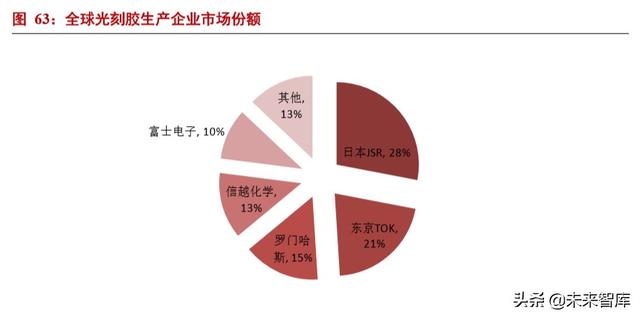 4. 光刻胶国产替代势在必行光刻胶行业具有极高的行业壁垒,因此在全球范围其行业都呈现寡头垄断的局面。光刻胶行业长年被日本和美国 专业公司垄断。目前前五大厂商就占据了全球光刻胶市场 87%的份额,行业集中度高。其中,日本 JSR、东京应化、 日本信越与富士电子材料市占率加和达到 72%。并且高分辨率的 KrF 和 ArF 半导体光刻胶核心技术亦基本被日本和美 国企业所垄断,产品绝大多数出自日本和美国公司,如杜邦、JSR 株式会社、信越化学、东京应化工业、Fujifilm,以 及韩国东进等企业。整个光刻胶市场格局来看,日本是光刻胶行业的巨头聚集地。