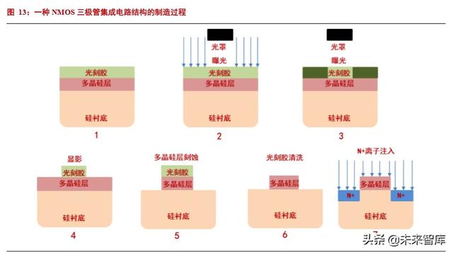在集成电路制造领域,如果说光刻机是推动制程技术进步的“引擎”,光刻胶就是这部“引擎”的“燃料”。下图展示 了光刻胶如何在一个 NMOS 三极管的制造工艺中发挥作用。NMOS 三级管是半导体制程工艺中最常用的集成电路结 构之一。