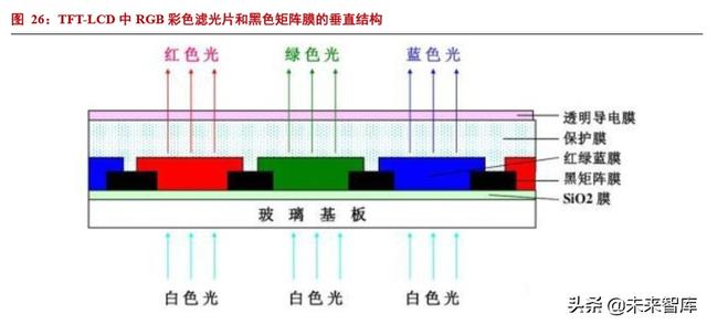TFT-LCD 技术利用半导体精确控制显示效果。TFT(Thin Film Transistor)LCD 即薄膜晶体管 LCD,是有源矩 阵类型液晶显示器(AM-LCD)中的一种。上图展示了 TFT 阵列和滤光片在 TFT-LCD 中的结构。TFT-LCD 的主要 特点是为每个原色像素点都配臵了一个半导体开关器件。通过控制 TFT 单元的电极电压,就可以使对应像三原 色像素点上的透光率发生变化。这样,每种原色像素点的灰度都可以得到精确的控制。若每个原色像素点可以有 255 个灰度阶数,那么三原色像素点就可以构成一千六百多万种颜色。这是 TFT-LCD 也被称为“真彩”屏幕技术 的原因之一。由于 TFT-LCD 每个像素点都相对独立,并可以进行连续控制,所以这样的设计方法还提高了显示 屏的反应速度。