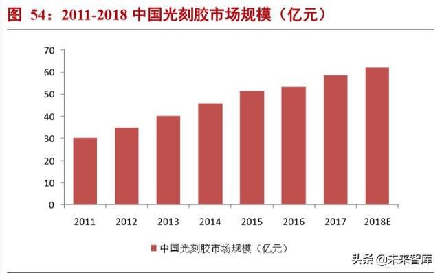 随着全球 PCB,面板和半导体行业增产能的东移,中国的光刻胶需求也在不断提升。依据前瞻产业研究院的数据, 2017 年我国光刻胶需求量已达 7.99 万吨,近年的年复合增长率达 14.69%;市场规模达到 58.7 亿元,年复合增长率达 11.59%。估计 2018 年光刻胶需求量在 8.44 万吨,市场规模约为 62.3 亿元。
