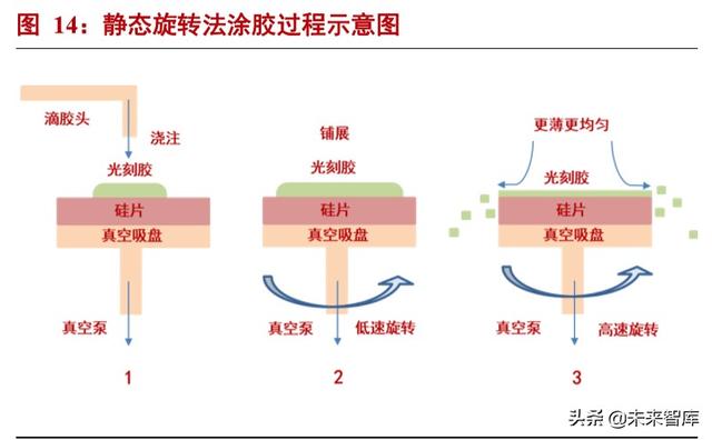 静态旋转法:首先把光刻胶通过滴胶头堆积在硅片的中心,然后低速旋转使得光刻胶铺开,再以高速旋转甩掉多 余的光刻胶。在高速旋转的过程中,光刻胶中的溶剂会挥发一部分。这个过程可以如图表 16 中所示。静态涂胶法中的 光刻胶堆积量非常关键,量少了会导致光刻胶不能充分覆盖硅片,量大了会导致光刻胶在硅片边缘堆积甚至流到硅片 的背面,影响工艺质量。