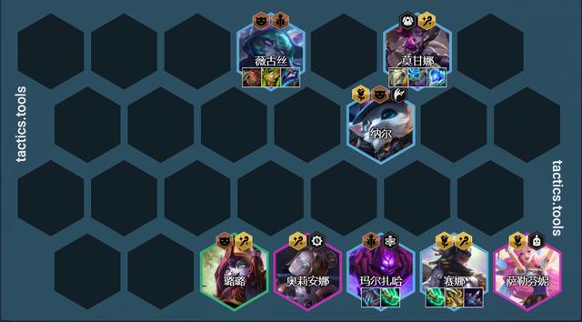 阵容组成:璐璐、纳尔、赛娜、莫甘娜、薇古丝、马尔扎哈、萨勒芬妮、发条