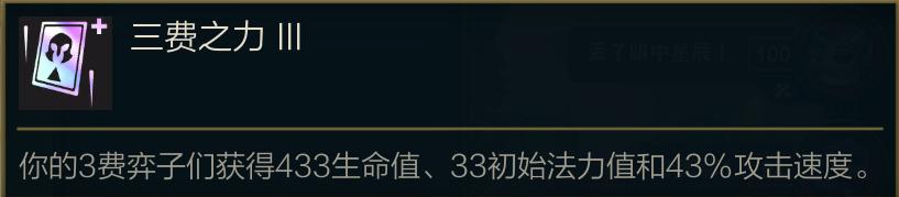 阵容核心:海克斯强化是这套阵容的关键,有三费之力就可以考虑,一般金色三费之力最佳,银色的稍微有点弱,而彩色三费之力非常容易碰到3彩局,3彩局能够拿到灌铅骰子那么天胡,没有的话会非常难受,节奏太快没有追出3星就GG。