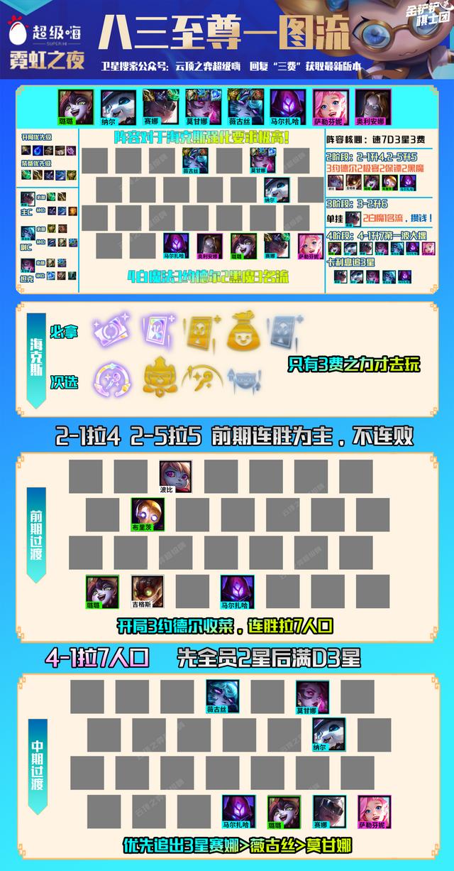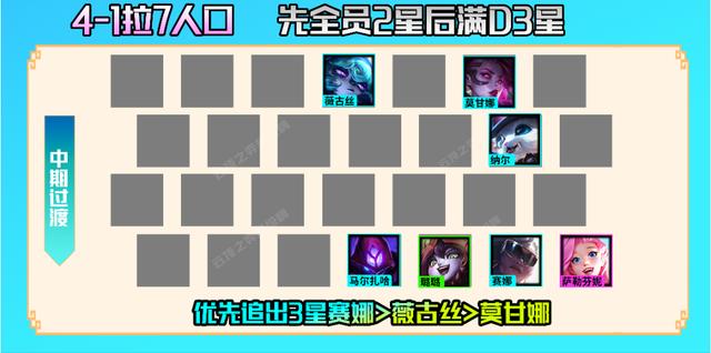 中期阵容:拉7人口有海克斯强化《三费之力》才建议大家去玩这套阵容,7人口先追全员3星,后再追3星赛娜>薇古丝>莫甘娜,薇古丝和璐璐利用3约德尔白嫖一般都比较容易3星。