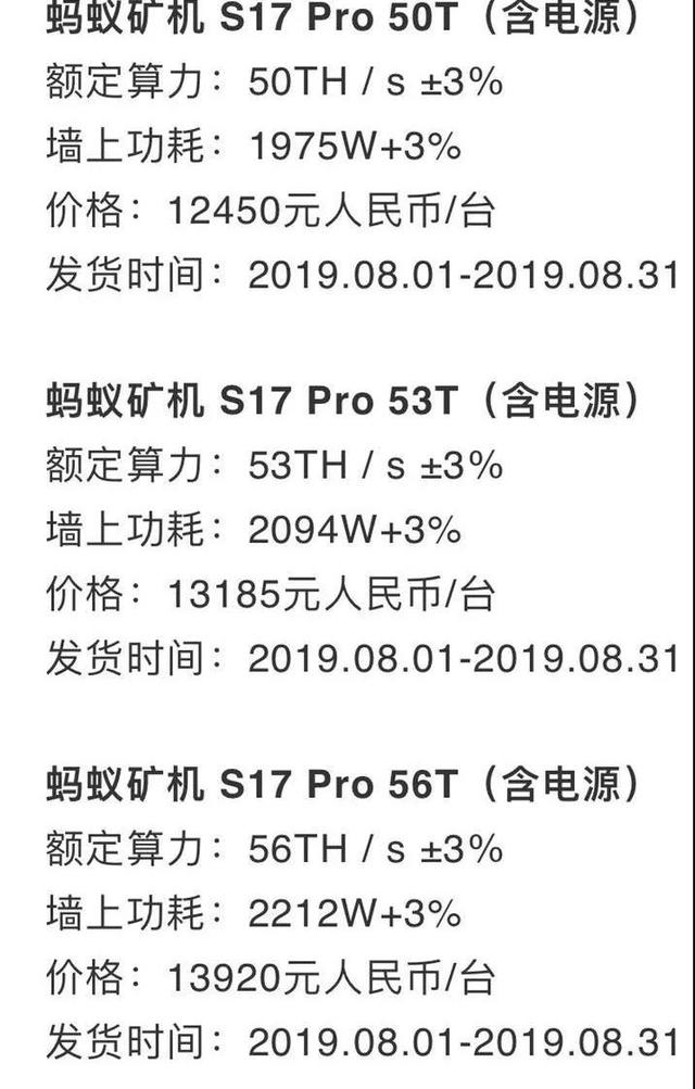 S17Pro算力为53HT/S,整机功耗为2094W,能效比39.5J/TH,目前官网期货发货时间为,2019年8月1日-2019年8月31日。
