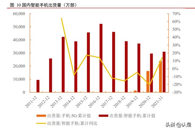 5G 撑起智能手机市场,出货量占比近八成。2017 年以来,智能手机市 场显现疲态,2020年全年,国内智能手机出货量为2.96亿部,同比下降20.4%, 延续了自 2017 年以来的下降趋势。但与此同时,5G 智能手机的产业升级趋 势愈发明显,不断从高端机型向中低端机型渗透。据信通院消息,2021 年 1- 11 月,我国 5G 手机出货量达 2.66 亿部,占国内智能手机出货量的 76%,同 比增长 63.5%,拉动智能手机整体出货量。国内 5G 智能手机渗透率远超全球 平均水平(出货量占比:40.7%),随着 5G 的技术普及与应用不断落地,全球 5G 手机普及率及出货量有望持续高增长。展望 2022 年,Counterpoint 预计 全球 5G 智能手机出货量将超过 8 亿部,取代 LTE 成为移动设备的主流无线 通信技术标准。