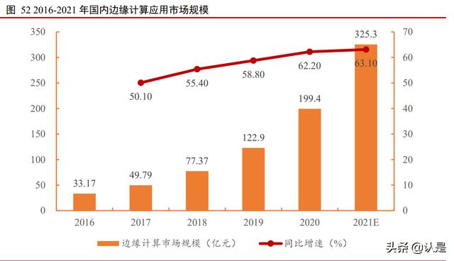 边缘计算作为巨大的增量市场,近年来国内市场增速均在 50%以上。根 据 IDC 数据,2020 年全球边缘计算市场规模约为 36 亿美元,并将以约 37%的 增速不断扩大,预计 2025 年该行业市场规模将达到 167 亿美元。据 CCID 数 据显示,2020 年,中国边缘计算市场规模达 199.4 亿元,同比增长 62.2%;2021 年中国边缘计算市场规模预计达到 325.3 亿元,同比增长 63.1%。典型应用 场景包括 5G 应用、AR/VR、无人机、医疗保健和智能交通等。