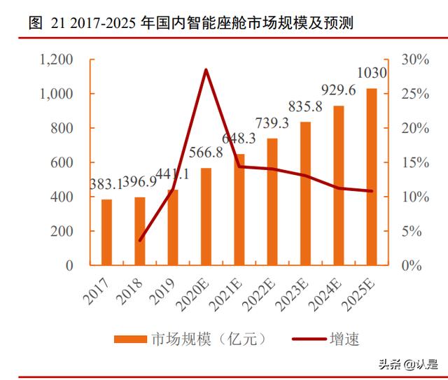 智能座舱市场规模及渗透率将加速提升。主流智能座舱包含全液晶仪表 盘、汽车中控屏、HUD 和流媒体后视镜等四大模块。2017 年国内智能座舱市 场规模约 383.1 亿元,2020 的市场规模测算达 566.8 亿元。未来随着用户需 求的增加以及产品的加速创新,我国智能座舱带来的市场空间将进一步扩大, 预计 2021-2025 年的市场年复合增速将达 15%,2025 年市场规模有望突破 1000 亿元。随着传统车企与电动车加大对智能座舱的产品配置,液晶仪表等 渗透率有望实现快速提升。IHS Markit 在《智能座舱市场与技术发展趋势研 究白皮书》中指出,2020 年,中国市场座舱智能配置水平的新车渗透率约为 48.8%,高于全球市场的装配率水平,到 2025 年预计可以超过 75%。