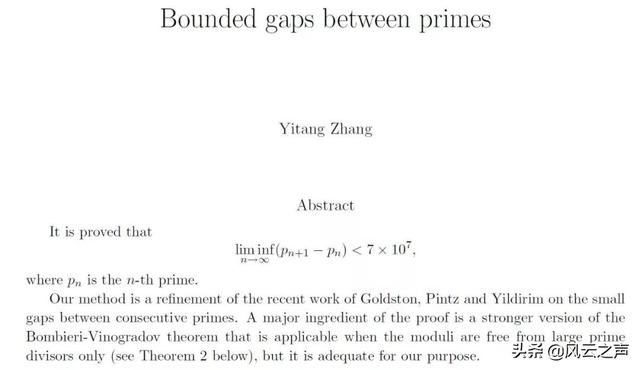 2013年4月17日,张益唐把论文提交给最著名的数学杂志《数学年刊》(Annuals of Mathematics)。那位欣赏他的系主任阿佩尔在两天后去世,值得欣慰的是他已经知道了张益唐的成果。这篇论文的标题十分简洁,叫做《质数间的有界距离》(Bounded gaps between primes)。摘要也十分简洁,我翻译如下: