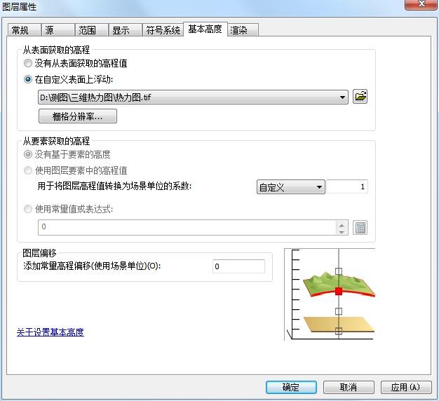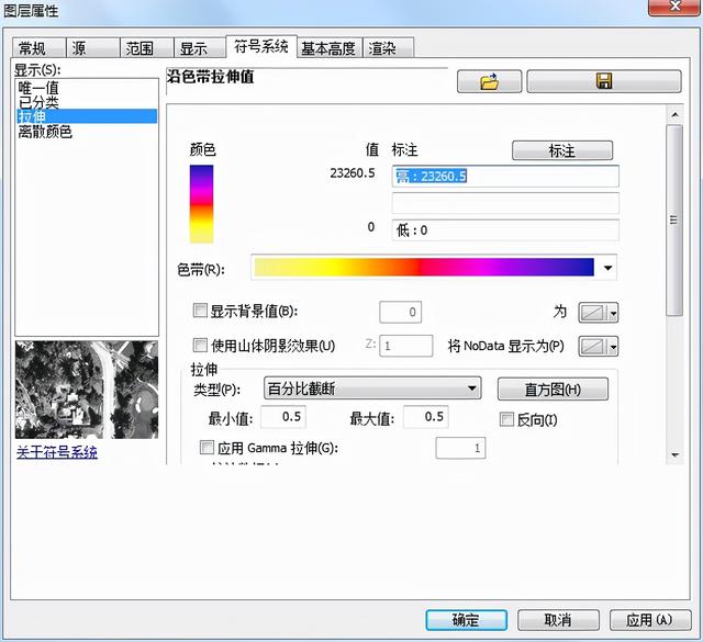 将导出的tif文件加载到ArcScene内,在图层属性对话框内,选择符号系统选项卡,修改一下色带,如下图所示。