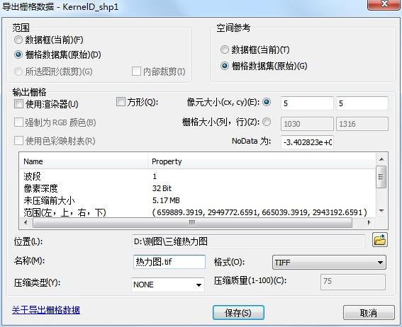 制作三维热力图在生成的热力图图层上点击右键,选择“数据导出数据”,将热力图导出为tif格式。
