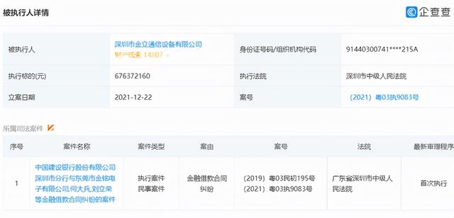 IT之家 12 月 23 日消息,12 月 22 日,金立手机关联公司深圳市金立通信设备有限公司新增一条被执行人信息,执行标的 6.76 亿余元,案号为(2021)粤 03 执 9083 号,执行法院为深圳市中级人民法院,关联案件为金融借款合同纠纷。